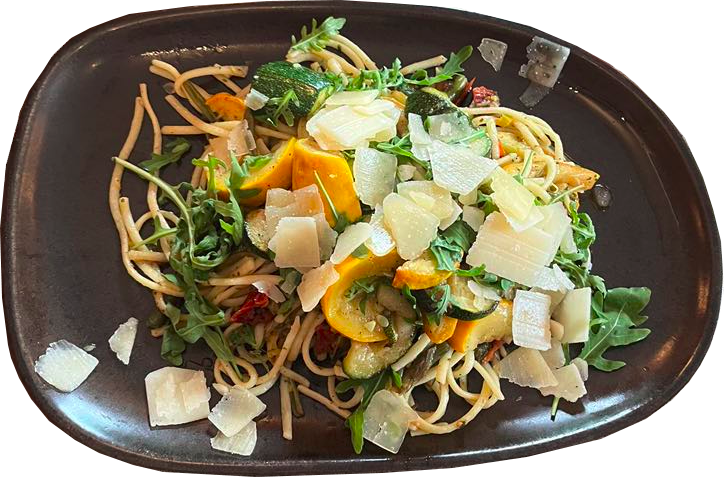 Pâtes fraîches aux légumes croquants, relevées d’une infusion au basilic, parsemées de roquette et de copeaux de parmesan.